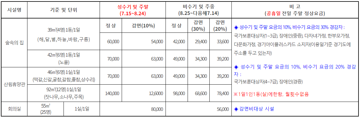 숙박시설의 경우, 정상가는 비수기 42,000원 ~ 성수기 140,000원까지 다양하게 책정되어 있습니다.