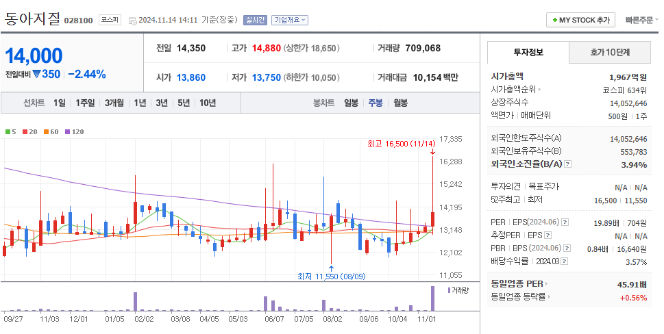 최근 동아지질의 주가는 13,210원으로, 지난 몇 달간의 주가 변동을 살펴보면 다소 불안정한 모습을 보였습니다. 52주 최고가는 16,180원이었으며, 최저가는 11,550원이었습니다. 최근 1개월 수익률은 -1.16%, 3개월 수익률은 -2.90%로, 전반적으로 하락세를 보이고 있습니다. 이러한 주가 동향은 시장의 전반적인 불안정성과 함께 동아지질의 내부적인 요인들이 복합적으로 작용한 결과로 분석됩니다.