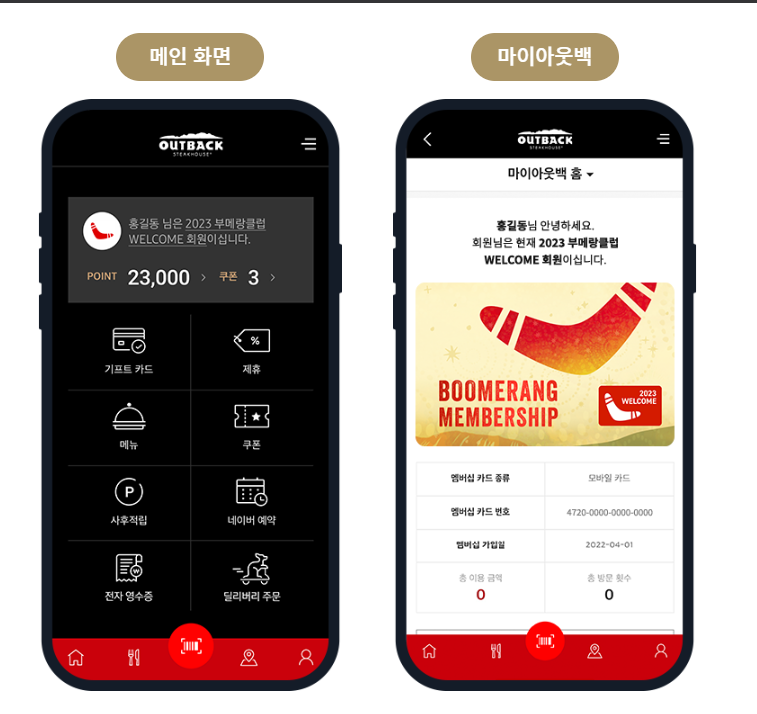 요즘은 모바일 어플리케이션을 통한 할인도 많이 활용되고 있습니다. 아웃백 스테이크 하우스의 전용 어플을 다운로드하면, 포인트 적립 및 쿠폰 사용이 가능하니 많은 분들이 이용하고 계십니다. 어플 내에서 사용 가능한 쿠폰과 포인트 정보는 아래 이미지를 참고하세요.