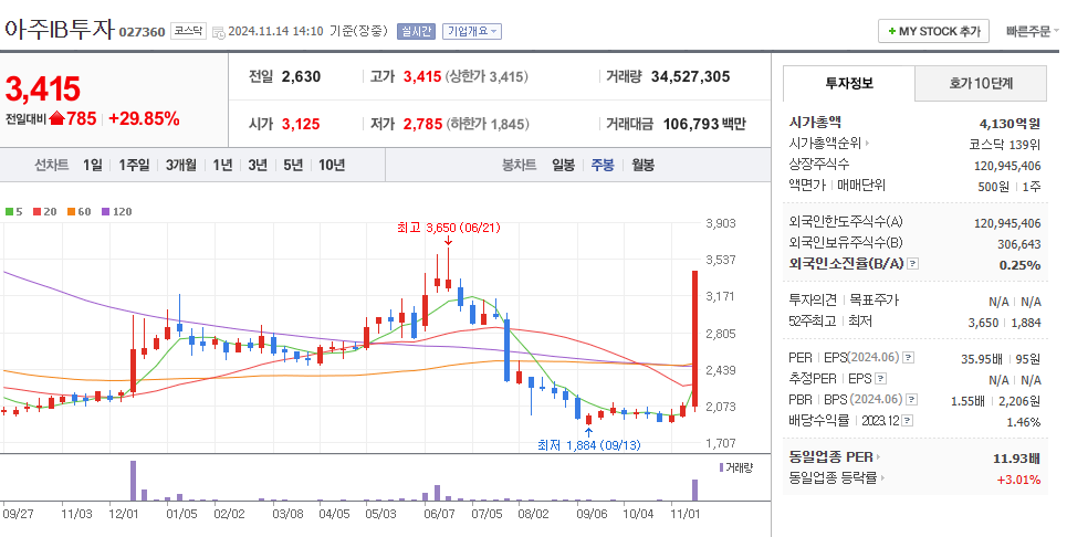 최근 아주IB투자의 주가는 급격한 상승세를 보였습니다. 특히, 스페이스X에 대한 투자 소식이 전해진 후 주가는 가격제한폭인 29.88%까지 급등하며 2,630원을 기록했습니다. 이러한 주가 상승은 투자자들에게 긍정적인 신호로 작용하고 있으며, 앞으로의 주가 전망에 대한 기대감을 높이고 있습니다. 하지만, 주가의 변동성이 크기 때문에 신중한 접근이 필요합니다.
