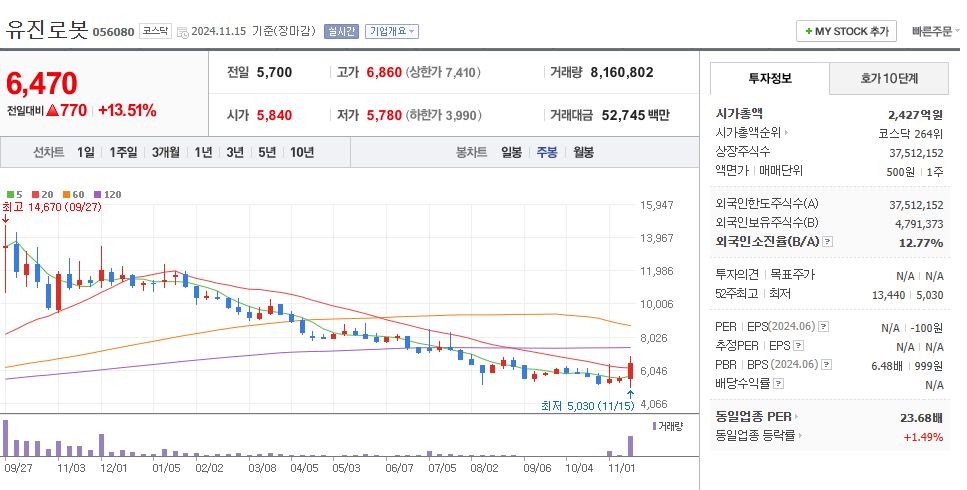 | 휴림로봇 시세 분석 및 주가 전망 (+전문가 의견) (0) | 2024.11.19 |