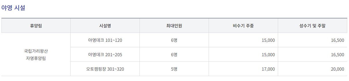 - 야영데크 : 1박 기준 약 20,000원 ~ 30,000원