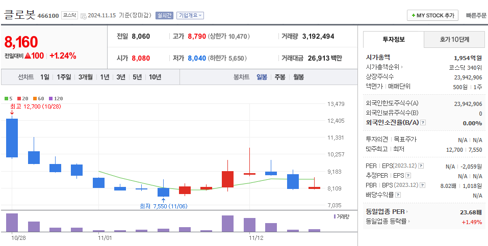 최근 클로봇의 주가는 다소 변동성이 있었습니다. 상장 초기에는 높은 경쟁률을 기록하며 주가가 급등했으나, 이후에는 조정세를 보이고 있습니다. 예를 들어, 최근 공모가는 희망 공모가 밴드 상단을 초과하여 1만3000원으로 확정되었고, 이는 시장에서 긍정적인 신호로 해석되고 있습니다. 하지만, 주가가 급락하는 상황도 발생하여 투자자들 사이에서 우려가 커지고 있습니다.