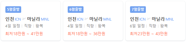 이처럼 마닐라에서 서울로 돌아오는 항공편도 다양한 시간대가 있으니, 여행 계획에 맞춰 예약하시면 좋습니다.